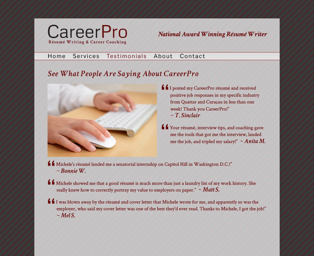 This is a website for CareerPro, a business owned by Michele McCann focused on resume writing and professional development. The website was designed and coded by me using Worpress with the Toolbox template. Please visit www.careerprousa.net to see the actual site.