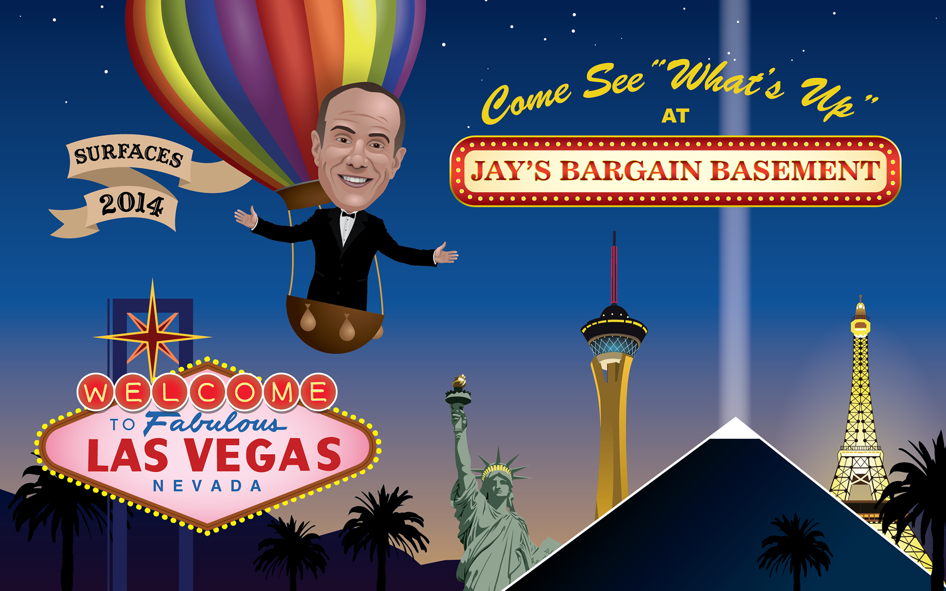 This was a postcard designed for Mannington to advertise their booth at the 2014 Surfaces convention. The client gave me a few photos of Jay, the salesman and told me they wanted him in a hot air balloon above Las Vegas. The rest was up to me.